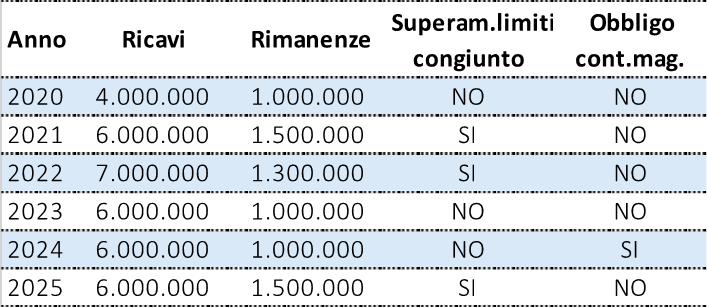 L’obbligo viene meno dall’esercizio successivo a quello in cui per la seconda volta consecutiva non si realizzano le condizioni sopra indicate (ricavi oltre 5.164 mln e rimanenze oltre 1,1 mln).